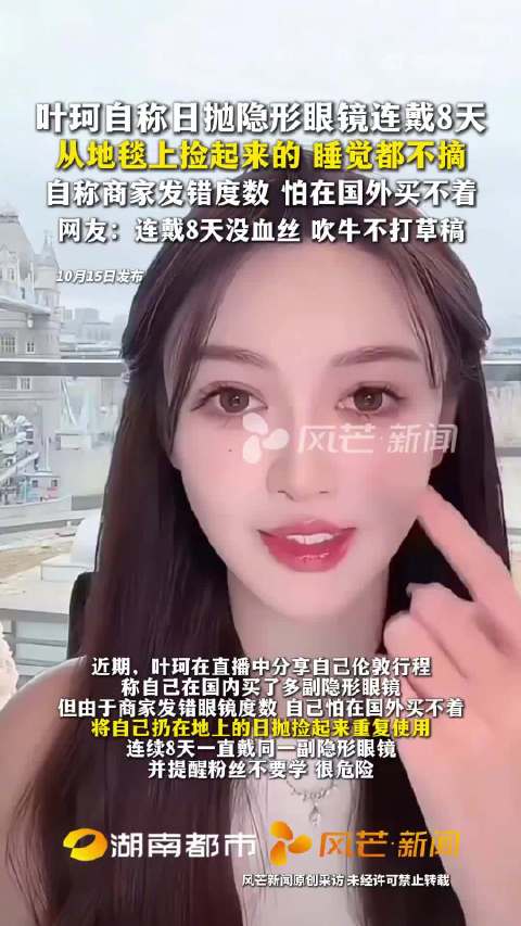 , 叶珂在直播中自曝因商家发错隐形眼镜度数,连续8天(包括睡眠时间)未摘取隐形眼镜,此行为引发网友广泛质疑与健康担忧&zwnj,,具体分析如下:  , 事件背景与核心争议&zwnj,  , 起因&zwnj,: 叶珂称赴英国前网购多盒隐形眼镜,但商家错发成600度镜片(仅1只可用),导致佩戴后视线模糊。她未在当地购买新镜片,而是将前一日丢弃在地毯上的日抛镜片用自来水泡开后重新佩戴,并连续8天未摘取,自称&ldquo,眼坚强&rdquo,,但坦言眼睛&ldquo,极度疲劳&rdquo,。  , 健康风险&zwnj,: 眼科医生多次提醒,普通隐形眼镜每日佩戴不宜超过8小时,睡眠时必须摘下。长期不摘易导致眼部缺氧、细菌滋生,引发角膜炎、角膜损伤等严重问题。叶珂的行为被网友批评为&ldquo,拿眼睛健康开玩笑&rdquo,。  , 网友反应与质疑&zwnj,  , 真实性存疑&zwnj,: 部分网友认为叶珂的描述&ldquo,夸张成分多&rdquo,,质疑其连续8天佩戴隐形眼镜却无血丝、无严重不适的真实性,甚至调侃她&ldquo,吹牛不打草稿&rdquo,。  , 行为不可取&zwnj,: 多数网友表示担忧,认为即使工作繁忙,也应优先保障健康,提醒&ldquo,不要模仿,很危险&rdquo,。有人分享自身经历,强调隐形眼镜佩戴规范的重要性。  , 事件延伸与行业提醒&zwnj,  , 隐形眼镜使用规范&zwnj,: 事件再次引发公众对隐形眼镜安全使用的关注。医生建议,佩戴前需确认度数准确,,避免使用过期或污染的镜片;每日佩戴时间严格控制,睡眠时务必摘下;出现眼部红肿、刺痛等症状应立即就医。  , 公众人物责任&zwnj,: 作为公众人物,叶珂的行为可能对粉丝产生误导。网友呼吁明星分享生活时需兼顾科学性,避免传播危险行为。 |